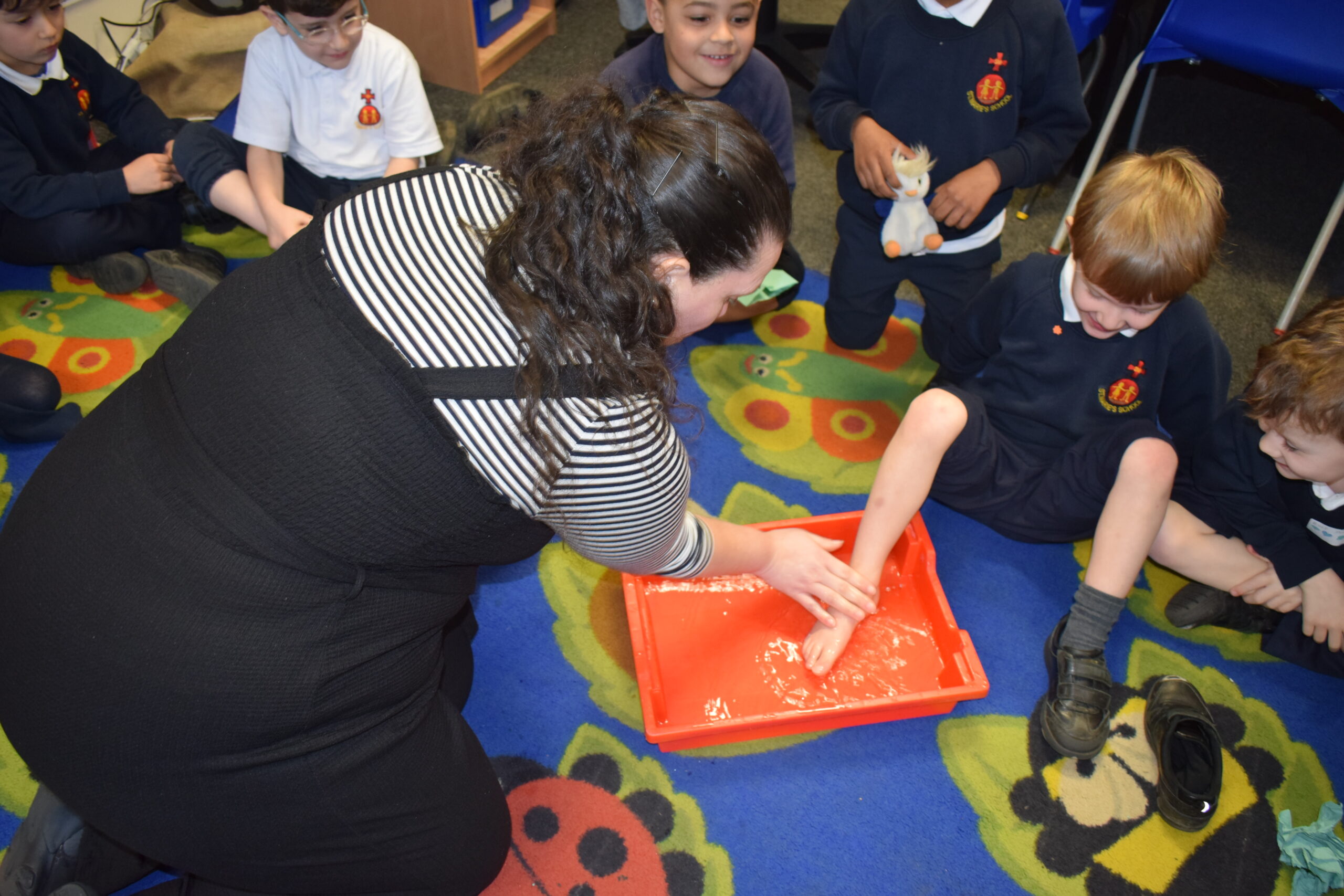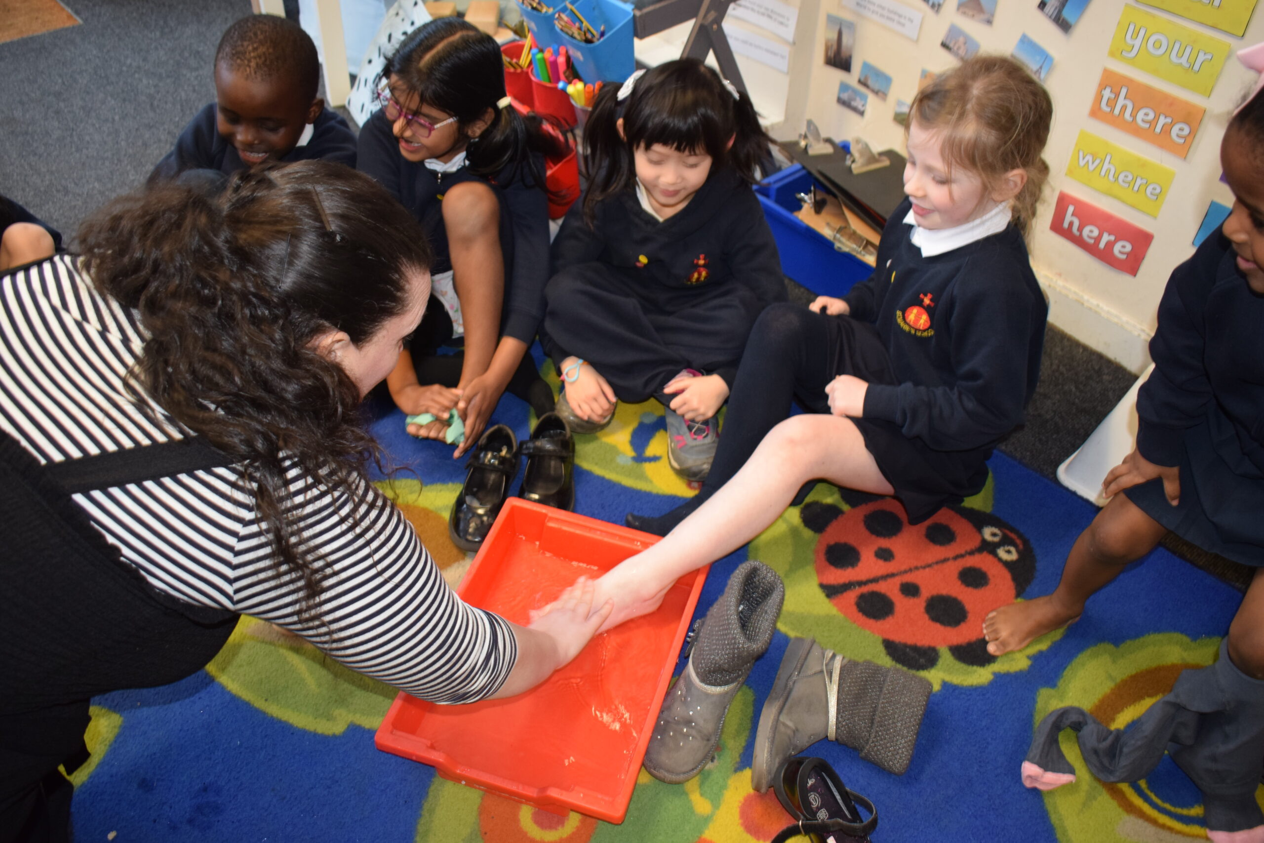 Today we learned more about the Last Supper. We already have lots of knowledge about the Last Supper from reading the scripture. Today we re-enacted the Last Supper and thought more about the meal being Jesus and his friends. We learned that before the Last Supper Jesus washed the disciples’ feet. We learned why people often washed their feet when they entered a house. Miss Healy washed our feet (if we wanted them washing) and then we washed Miss Healy’s feet because we decided it would be fair to all have our feet washed.