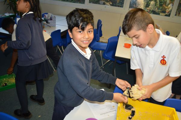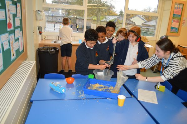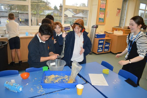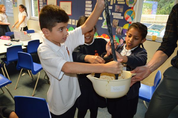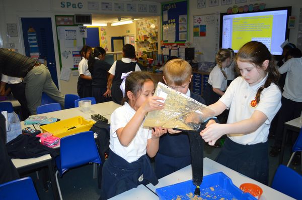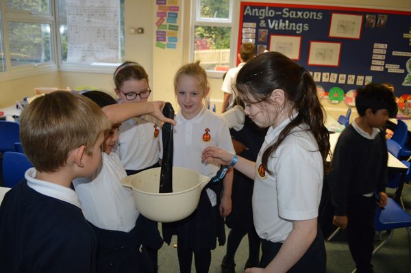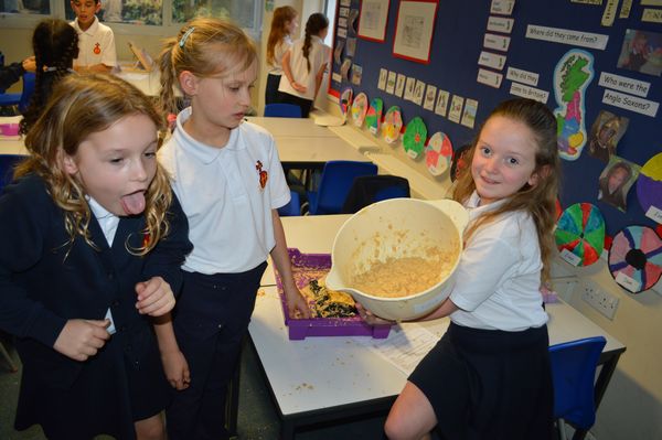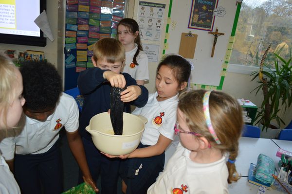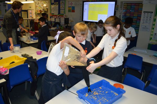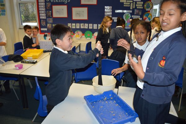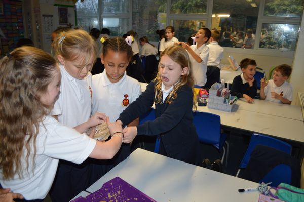 On Wednesday, the children used leftovers from lunch to take the food on a journey through our very own digestive system – including tights and mixing bowls!